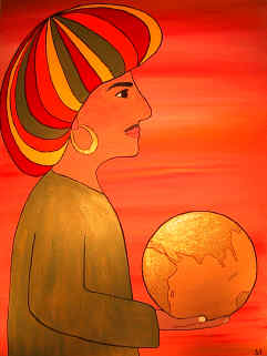 Flamboyant King holds a golden globe in his hand and envisions the future with